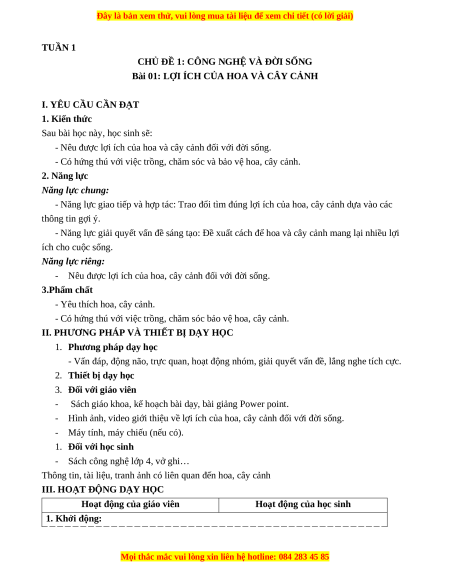 Giáo án Bài 1 Công nghệ lớp 4 Cánh diều: Lợi ích của hoa và cây cảnh