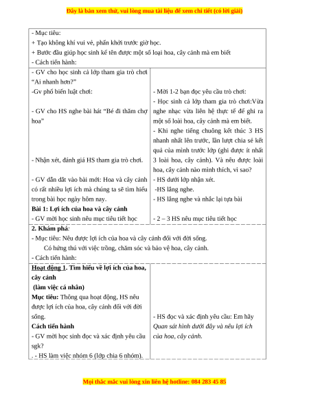 - Mục tiêu: Nêu được lợi ích của hoa và cây cảnh đối với đời sống.
