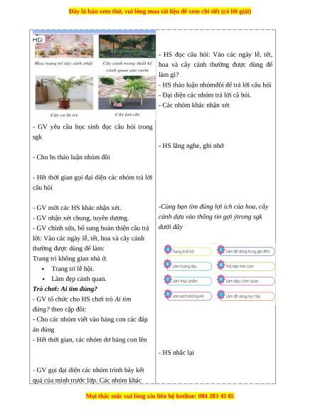 - Năng lực giao tiếp và hợp tác: Trao đổi tìm đúng lợi ích của hoa, cây cảnh dựa vào các thông tin gợi ý.