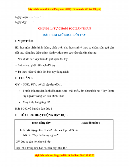 Giáo án Bài 1 Đạo đức 1 Kết nối tri thức: Em giữ sạch đôi tay