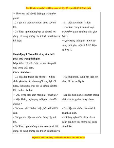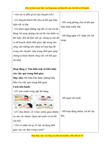 hiện của việc quý trọng thời gian. Cách tiến hành:
