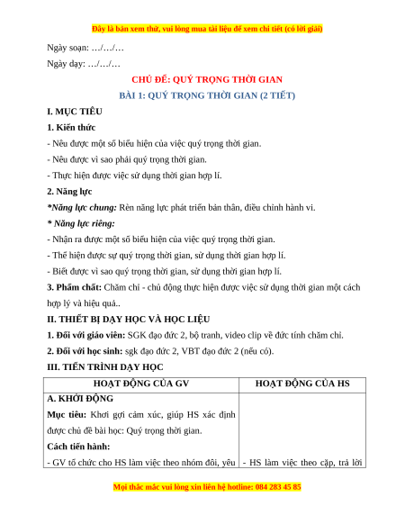 BÀI 1: QUÝ TRỌNG THỜI GIAN (2 TIẾT) I. MỤC TIÊU 1. Kiến thức
