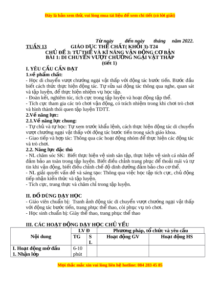 Ư THẾ VÀ KĨ NĂNG V N Ậ Đ N Ộ G C B Ơ N Ả BÀI 1: DI CHUY N Ể VƯ T Ợ CHƯ N Ớ G NG I Ạ V T Ậ TH P Ấ (ti t ế 1) I. YÊU CẦU CẦN ĐẠT 1.v ph ề m ẩ chất: - H c ọ di chuy n ể vư t ợ chư ng ớ ng i ạ v t ậ th p ấ v i ớ đ ng ộ tác bư c ớ ti n. ế Bư c ớ đ u ầ bi t ế cách th c ứ th c ự hi n ệ đ ng ộ tác. Tự s a ử sai đ ng