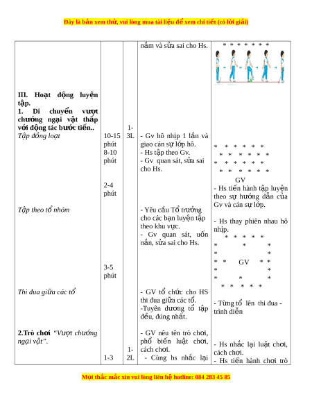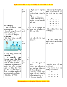 Đây là bản xem th , vu ử i lòng mua tài li u ệ đ xe ể m chi ti t (c ế ó l i ờ gi i ả ) 1-2 - Nghe cán bộ l p ớ báo - Cán sư t p ậ trung l p, ớ phút cáo. đi m ể số, báo cáo sĩ s , ố - H i ỏ về s c ứ kh e ỏ c a ủ tình hình l p ớ h c ọ cho Hs. Gv. - Thầy trò chúc nhau. - Phổ bi n ế n i ộ dung, GV nhi m ệ vụ và yêu c u ầ * * * * * * * * gi h ờ c. ọ * * * * * * * * * * * * * * 2. Kh i ở đ ng ộ * * * * * * * - Ch y ạ nhẹ nhàng 1 vòng 1- - GV di chuy n ể và quanh sân t p. ậ 3-5 2L quan sát, chỉ d n ẫ cho - Cán sự đi u ề khi n ể l p ớ - Xoay các kh p c ớ ổ tay, cổ phút HS th c hi ự n. ệ kh i ở đ ng ộ . chân, vai, hông, gối,... - T p bài ậ võ 27 đ ng t ộ ác. 3. Trò ch i ơ . - Trò ch i ơ “Ch y ạ t i ạ chỗ -Gv tổ ch c ứ Hs ch i ơ theo tín hi u” ệ trò ch i ơ . - Hs ch i ơ đúng lu t ậ , 1-2 nhiệt tình sôi n i ổ và đ m ả phút b o ả an toàn. II. Hoạt đ ng ộ hình thành ki n t ế h c. ứ * Di chuy n ể vư t ợ 1- chư ng ớ ng i ạ v t ậ th p ấ 2L v i ớ đ ng t ộ ác bư c t ớ i n. ế 5-7 + TTCB: Đ ng t ứ nhi ự ên phú - Cho HS quan sát + Đ ng ộ tác: Đi thư ng ờ về tranh - Hs l ng ắ nghe, ti p ế thu trư c, ớ khi g p ặ chư ng ớ - GV làm m u ẫ đ ng ộ và ghi nh . ớ ng i ạ v t ậ th p ấ thì bư c ớ tác k t ế h p ợ phân tích - T p ậ luy n ệ theo sự qua, hai tay ph i ố h p ợ tự kĩ thu t ậ đ ng t ộ ác. hư ng ớ d n c ẫ a ủ Gv. nhiên, m t ắ nhìn đư ng ờ đi. - Hô nh p ị và th c ự hi n ệ GV Sau đó đi thư ng v ờ đí ề ch. đ ng ộ tác m u, ẫ hư ng ớ * * * * * * * * + K t ế thúc: v ề TTCB dẫn Hs th c hi ự ện đt. * * * * * * * - Gv quan sát, uốn * * * * * * * M i