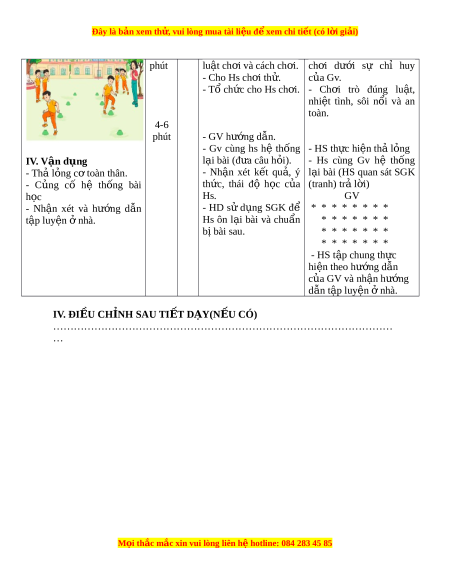 Đây là bản xem th , vu ử i lòng mua tài li u ệ đ xe ể m chi ti t (c ế ó l i ờ gi i ả ) phút lu t ậ ch i ơ và cách ch i ơ . ch i ơ dư i ớ sự chỉ huy - Cho Hs ch i ơ th . ử c a ủ Gv. - Tổ ch c ứ cho Hs ch i ơ . - Ch i ơ trò đúng lu t ậ , nhiệt tình, sôi n i ổ và an toàn. 4-6 phút - GV hư ng d ớ ẫn. - Gv cùng hs hệ th ng ố - HS th c hi ự n t ệ h l ả ng ỏ IV. Vận dụng l i ạ bài (đ a câu h ư i ỏ ). - Hs cùng Gv hệ th ng ố - Thả l ng c ỏ t ơ oàn thân. - Nh n ậ xét k t ế qu , ả ý l i ạ bài (HS quan sát SGK - C ng ủ cố hệ th ng ố bài th c, ứ thái độ h c ọ c a ủ (tranh) tr l ả i ờ ) h c ọ Hs. GV - Nh n ậ xét và hư ng ớ d n ẫ - HD sử d ng ụ SGK để * * * * * * * * t p l ậ uyện nhà. ở Hs ôn l i ạ bài và chu n ẩ * * * * * * * bị bài sau. * * * * * * * * * * * * * * - HS t p chung t ậ h c ự hiện theo hư ng ớ d n ẫ c a ủ GV và nh n h ậ ư ng ớ dẫn t p l ậ uyện nhà. ở IV. ĐIỀU CH N Ỉ H SAU TI T Ế D Y Ạ (N U Ế CÓ)