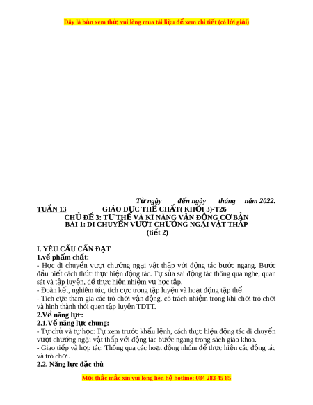 và hình thành thói quen t p ậ luy n ệ TDTT. 2.V năng l ề c: ự 2.1.V năng l ề c chung ự : - Tự chủ và t ự h c: ọ Tự xem trư c ớ kh u ẩ l nh, ệ cách th c ự hi n ệ đ ng ộ tác di chuy n ể vư t ợ chư ng ng ớ i ạ v t ậ th p v ấ i ớ đ ng t ộ ác bư c ớ ti n t ế rong sách giáo khoa. - Giao ti p ế và h p ợ tác: Thông qua các ho t ạ đ ng ộ nhóm đ t ể h c ự hi n ệ các đ ng ộ tác và trò ch i ơ . 2.2. Năng l c đ ự c t ặ hù - NL chăm sóc SK: Bi t ế th c ự hi n ệ v ệ sinh sân t p, ậ th c ự hi n ệ v ệ sinh cá nhân để đ m ả b o ả an toàn trong t p ậ luy n. ệ Bi t ế đi u ề ch nh ỉ trang ph c ụ đ ể tho i ả mái và tự tin khi v n ậ đ ng, bi ộ t ế đi u ch ề nh ch ỉ đ ế di ộ nh dư ng ỡ đ m ả b o ả cho c t ơ h . ể - NL gi i ả quy t ế v n ấ dề và sáng t o: ạ Thông qua vi c ệ h c ọ t p ậ tích c c, ự ch ủ đ ng ộ ti p nh ế n ậ ki n t ế h c và t ứ p ậ luy n. ệ - Tích c c, t ự rung th c và chăm ự ch t ỉ rong t p l ậ uy n. ệ II. Đ D Ồ ÙNG D Y Ạ H C Ọ - Giáo viên chu n ẩ b : ị Tranh nh ả đ ng ộ tác di chuy n ể vư t ợ chư ng ớ ng i ạ v t ậ th p ấ v i ớ đ ng ộ tác bư c ớ ti n ế , trang ph c ụ th t ể hao, còi ph c v ụ ụ trò ch i ơ . - H c s ọ inh chu n b ẩ :