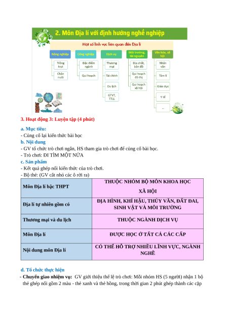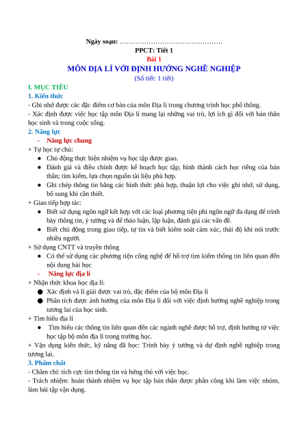 MÔN ĐỊA LÍ VỚI ĐỊNH HƯỚNG NGHỀ NGHIỆP (Số tiết: 1 tiết) I. MỤC TIÊU 1. Kiến thức