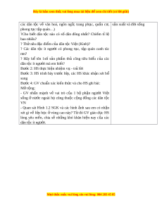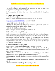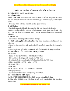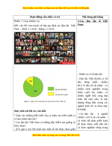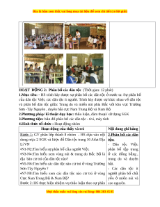 nhau trong quá trình xây d ng và b ự o ả v t ệ qu ổ c. ố - Các dân t c có đi ộ m ể nào khác nhau? Bư c 2: ớ HS quan sát video và b ng ằ hi u bi ể t ế đ t ể r l ả i ờ Bư c 3: ớ HS trình bày k t ế qu , b ả s ổ ung Bư c ớ 4: GV nh n ậ xét và d n ẫ d t ắ HS vào bài h c: ọ Vi t ệ Nam là m t ộ qu c ố gia có nhi u ề dân t c ộ cùng chung s ng. ố Các dân t c ộ tuy khác nhau v ề m t ộ s ố đ c ặ đi m ể nh ng ư v i ớ truy n ề th ng ố yêu nư c, ớ đoàn k t ế , các dân t c ộ đã sát cánh bên nhau trong su t ố quá trình xây d ng ự và b o ả vệ tổ qu c. ố Bài h c ọ hôm nay chúng ta sẽ cùng tìm hi u ể về c ng ộ đ ng ồ các dân t c ộ V ở N: các dân t c ộ VN có đ c ặ đi m ể gì? S phân b ự ố c a ủ các dân t c…. ộ B.HÌNH THÀNH KI N Ế TH C Ứ M I Ớ : HOẠT Đ N Ộ G 1: Các dân t c ộ ở Vi t ệ Nam ( Th i ờ gian : 20 phút)