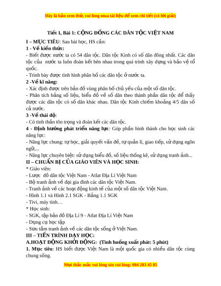 - Hình 1.1 và Hình 2.1 SGK - B ng ả 1.1 SGK - Tivi, máy tính… * H c ọ sinh: - SGK, t p b ậ n ả đ Đ ồ a L ị í 9 - Atlat Đ a L ị í Vi t ệ Nam - D ng c ụ h ụ c ọ t p ậ - S u t ư m ầ tranh nh ả v các dân t ề c ộ s ng ố ở Vi t ệ Nam. III – TI N Ế TRÌNH D Y Ạ H C Ọ : A.HOẠT Đ N Ộ G KH I Ở Đ N Ộ G: (Tình hu ng xu ố t ấ phát: 5 phút) 1. M c ụ tiêu: HS bi t ế đư c ợ Vi t ệ Nam là m t ộ qu c ố gia có nhi u ề dân t c ộ cùng chung sống. M i ọ thắc m c