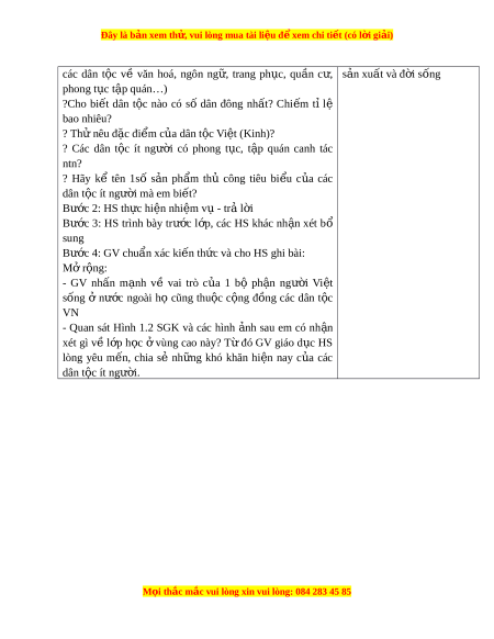 ộ có số dân khác nhau và trình độ phát tri n ể kinh tế khác nhau, mỗi dân t c ộ có kinh nghi m ệ riêng trong s n ả xu t ấ . 2.Phư ng ơ pháp/ kĩ thu t ậ d y ạ h c: ọ Tr c ự quan, đàm tho i ạ /Sử d ng ụ tranh nh, ả SGK 3.Phư ng ơ ti n ệ : Hình nh ả về trang ph c, ụ phong t c, ụ ho t ạ đ ng ộ kinh t ế c a ủ các dân t c ộ 4.Hình th c t ứ ch ổ c ho ứ t ạ đ ng ộ : HS ho t ạ đ ng cá nhân ộ M i ọ thắc m c