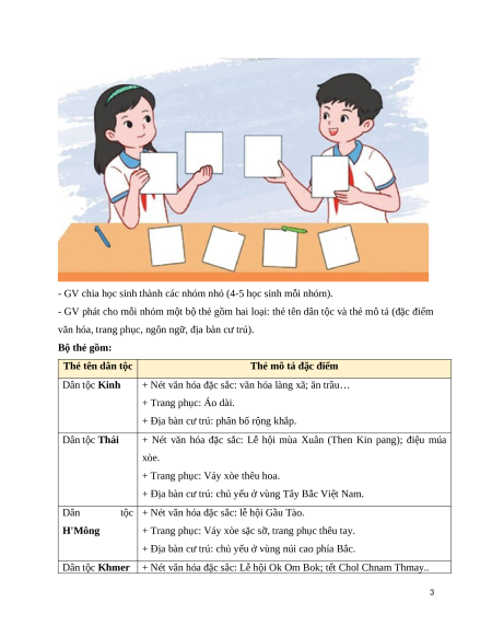 - GV phát cho mỗi nhóm một bộ thẻ gồm hai loại: thẻ tên dân tộc và thẻ mô tả (đặc điểm