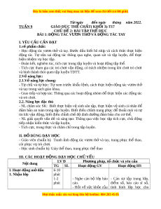Ủ Ề 2: BÀI TẬP TH D Ể C Ụ BÀI 1: Đ N Ộ G TÁC VƯ N Ơ TH Ở VÀ Đ N Ộ G TÁC TAY I. YÊU CẦU CẦN ĐẠT 1.v ph ề m ẩ chất: - H c ọ đ ng ộ tác vư n ơ thở và tay. Bư c ớ đ u ầ bi t ế hô nh p ị và cách th c ứ th c ự hi n ệ đ ng ộ tác. Tự s a ử sai đ ng