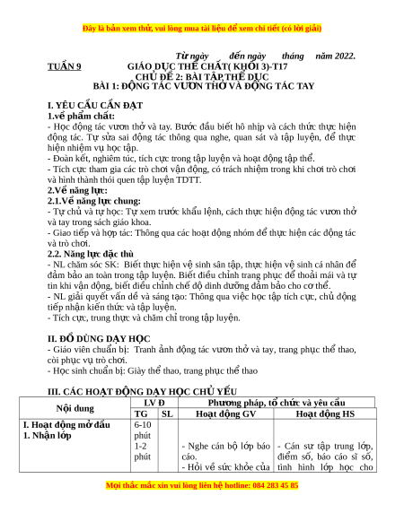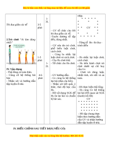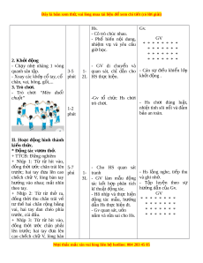 và tay trong sách giáo khoa. - Giao ti p ế và h p ợ tác: Thông qua các ho t ạ đ ng ộ nhóm đ t ể h c ự hi n ệ các đ ng ộ tác và trò ch i ơ . 2.2. Năng l c đ ự c t ặ hù - NL chăm sóc SK: Bi t ế th c ự hi n ệ v ệ sinh sân t p, ậ th c ự hi n ệ v ệ sinh cá nhân để đ m ả b o ả an toàn trong t p ậ luy n. ệ Bi t ế đi u ề ch nh ỉ trang ph c ụ đ ể tho i ả mái và tự tin khi v n ậ đ ng, bi ộ t ế đi u ch ề nh ch ỉ đ ế di ộ nh dư ng ỡ đ m ả b o ả cho c t ơ h . ể - NL gi i ả quy t ế v n ấ dề và sáng t o: ạ Thông qua vi c ệ h c ọ t p ậ tích c c, ự ch ủ đ ng ộ ti p nh ế n ậ ki n t ế h c và t ứ p ậ luy n. ệ - Tích c c, t ự rung th c và chăm ự ch t ỉ rong t p l ậ uy n. ệ II. Đ D Ồ ÙNG D Y Ạ H C Ọ - Giáo viên chu n ẩ b : ị Tranh nh ả đ ng ộ tác vư n ơ thở và tay, trang ph c ụ thể thao, còi ph c ụ v t ụ rò ch i ơ . - H c s ọ inh chu n b ẩ :