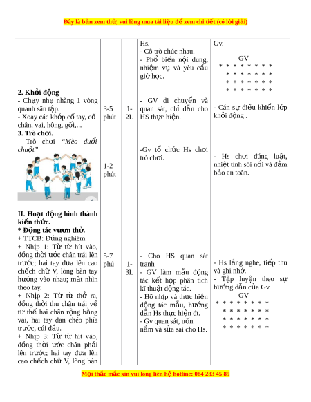 Đây là bản xem th , vu ử i lòng mua tài li u ệ đ xe ể m chi ti t (c ế ó l i ờ gi i ả ) Hs. Gv. - Cô trò chúc nhau. - Phổ bi n ế n i ộ dung, GV nhi m ệ vụ và yêu c u ầ * * * * * * * * gi h ờ c. ọ * * * * * * * * * * * * * * 2. Kh i ở đ ng ộ * * * * * * * - Ch y ạ nhẹ nhàng 1 vòng - GV di chuy n ể và quanh sân t p. ậ 3-5 1- quan sát, chỉ d n ẫ cho - Cán sự đi u ề khi n ể l p ớ - Xoay các kh p c ớ ổ tay, cổ phút 2L HS th c hi ự n. ệ kh i ở đ ng ộ . chân, vai, hông, gối,... 3. Trò ch i ơ . - Trò ch i ơ “Mèo đu i ổ chu t ộ ” -Gv tổ ch c ứ Hs ch i ơ trò ch i ơ . - Hs ch i ơ đúng lu t ậ , 1-2 nhiệt tình sôi n i ổ và đ m ả phút b o ả an toàn. II. Hoạt đ ng ộ hình thành ki n t ế h c. ứ * Đ ng t ộ ác vư n t ơ h . ở + TTCB: Đ ng nghi ứ êm + Nh p ị 1: Từ từ hít vào, đồng th i ờ ư c ớ chân trái lên 5-7 - Cho HS quan sát trư c; ớ hai tay đ a ư lên cao phú 1- tranh - Hs l ng ắ nghe, ti p ế thu ch ch ế chữ V, lòng bàn tay 3L - GV làm m u ẫ đ ng ộ và ghi nh . ớ hư ng ớ vào nhau; m t ắ nhìn tác k t ế h p ợ phân tích - T p ậ luy n ệ theo sự theo tay. kĩ thu t ậ đ ng t ộ ác. hư ng ớ d n c ẫ a ủ Gv. + Nh p ị 2: Từ từ thở ra, - Hô nh p ị và th c ự hi n ệ GV đồng th i ờ thu chân trái về đ ng ộ tác m u, ẫ hư ng ớ * * * * * * * * tư thế hai chân r ng ộ b ng ằ dẫn Hs th c hi ự ện đt. * * * * * * * vai, hai tay đan chéo phía - Gv quan sát, uốn * * * * * * * trư c, ớ cúi đ u. ầ n m ắ và s a ử sai cho Hs. * * * * * * * + Nh p ị 3: Từ từ hít vào, đồng th i ờ ư c ớ chân ph i ả lên trư c; ớ hai tay đ a ư lên cao ch ch ế chữ V, lòng bàn M i