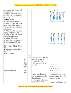 Đây là bản xem th , vu ử i lòng mua tài li u ệ đ xe ể m chi ti t (c ế ó l i ờ gi i ả ) tay hư ng ớ vào nhau; m t ắ nhìn theo tay. + Nh p 4 ị : V ề TTCB th r ở a. + Nh p ị 5, 6, 7,8 như nh p ị 1, 2, 3, 4. * Đ ng t ộ ác tay. + TTCB: Đ ng nghi ứ êm + Nh p ị 1: Chân trái bư c ớ sang ngang r ng ộ b ng ằ vai; hai tay đ a ư ra trư c, ớ long bàn tay úp. + Nh p ị 2: Hai tay dang ngang, long bàn tay úp. + Nh p ị 3: Hai bàn tay vỗ vào nhau trư c ng ớ c. ự + Nh p 4 ị : V ề TTCB. + Nh p ị 5, 6, 7,8 như nh p ị 1, 2, 3, 4 nh ng đ ư ổi bên. III. Hoạt đ ng ộ luy n ệ tập. 1. Đ ng ộ tác vư n ơ thở và tay. T p đ ậ ồng lo t ạ 1- 3L - Gv hô nhịp 1 l n ầ và 10- giao cán sự l p hô. ớ 15 - Hs t p t ậ heo Gv. phút - Gv quan sát, s a ử sai 8-10 cho Hs. * * * * * * phút * * * * * * * * * * * * T p t ậ heo tổ nhóm 2-4 * * * * * * phút GV - Yêu cầu Tổ trư ng ở - Hs ti n ế hành t p ậ luy n ệ cho các b n ạ luy n t ệ p ậ theo sự hư ng ớ d n ẫ c a ủ theo khu v c. ự Gv và cán s l ự p ớ . - Gv quan sát, u n ố n n, s ắ a ử sai cho Hs. - Hs thay phiên nhau hô M i