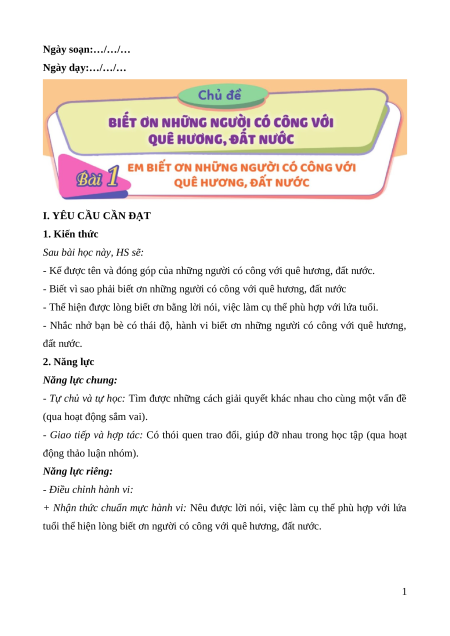 Giáo án Bài 1: Em biết ơn những người có công với quê hương, đất nước Đạo đức lớp 5 Cánh diều
