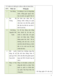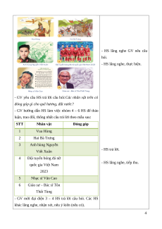 luận, trao đổi, thống nhất câu trả lời theo mẫu sau: STT Nhân vật Đóng góp 1 Vua Hùng 2 Hai Bà Trưng 3 Anh hùng Nguyễn Viết Xuân - HS trả lời. 4