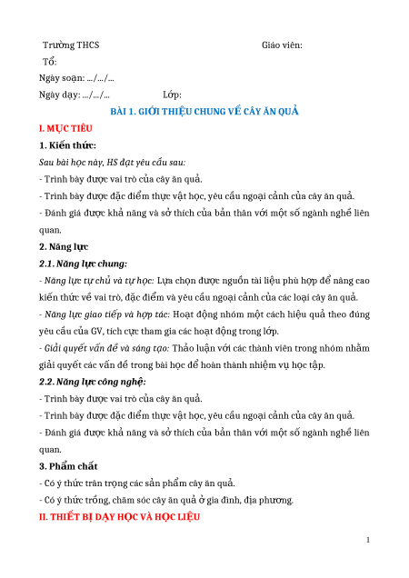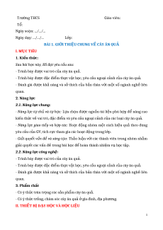 Tr ng THCS ườ Giáo viên: Tổ: Ngày so n: .../.../... ạ Ngày d y: .../.../... ạ Lớp: BÀI 1. GI I THI Ớ U CHUNG V Ệ CÂY ĂN QU Ề Ả I. M C TIÊU Ụ 1. Ki n th ế c: ứ