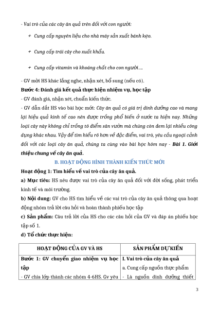 ộ dung: HS quan sát Hình 1.1 SGK tr.5 và trả l i ờ câu h i ỏ trong m c ụ Kh i ở động nêu ở đầu bài. c) S n ả ph m: ẩ Câu trả l i ờ c a ủ HS về m t ộ số lo i ạ cây ăn qu ả ph ổ bi n ế và vai trò c a chúng đ ủ i v ố i con ng ớ i. ườ d) Tổ ch c th ứ c hi ự n: ệ