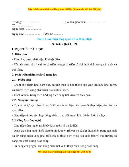 Bộ giáo án Công nghệ Điện - Điện tử 12 Kết nối tri thức đã cập nhật đủ Cả năm.