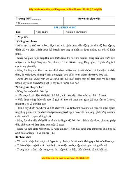 Tổ: ……………………… BÀI 1: ESTER - LIPID Lớp: Ngày soạn: Thời gian thực hiện: I. Mục tiêu 1) Năng lực chung