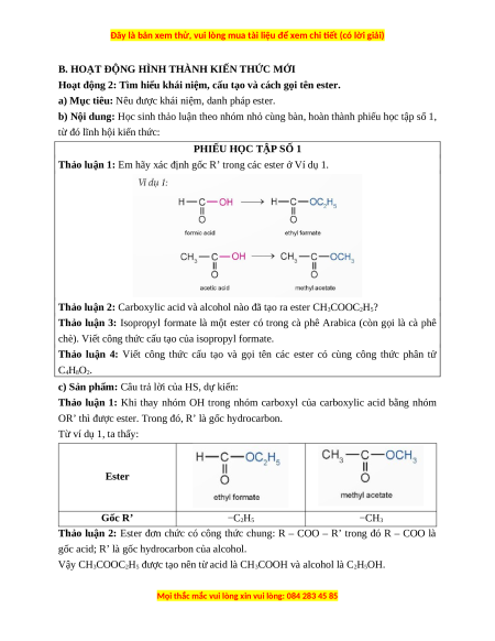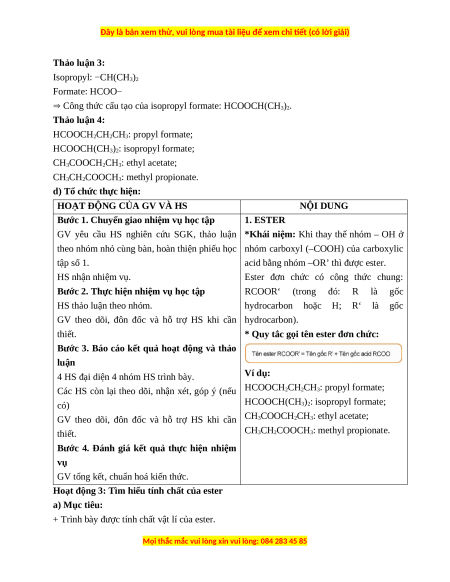Giáo án Bài 1 Hóa học 12 Chân trời sáng tạo: Ester – Lipid