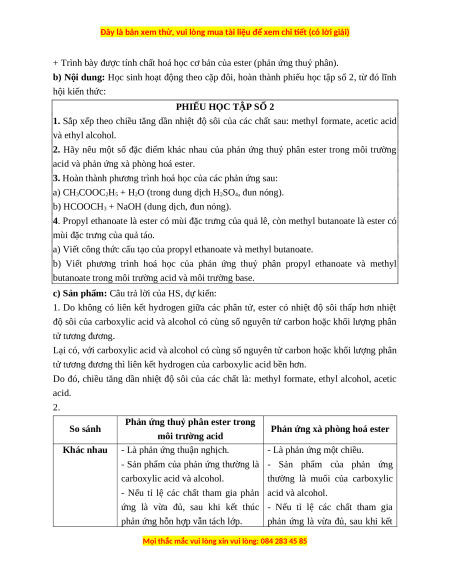 + Trình bày được đặc điểm về tính chất vật lí và tính chất hoá học cơ bản của ester (phản