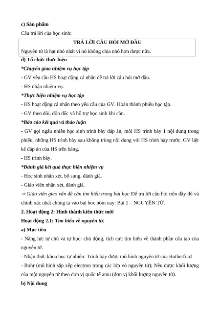 Giáo án Bài 1 Hóa học 7 Cánh diều: Nguyên tử