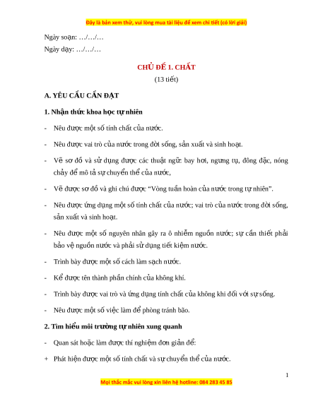 Ngày so n ạ : …/…/… Ngày d y ạ : …/…/… CHỦ Đ Ề 1. CH T Ấ (13 ti t ế ) A. YÊU C U Ầ C N Ầ Đ T Ạ 1. Nh n ậ th c ứ khoa h c ọ t ự nhiên - Nêu đ c ượ m t ộ s ố tính ch t ấ c a ủ n c. ướ - Nêu đ c ượ vai trò c a ủ n c ướ trong đ i ờ s n ố g, s n ả xu t ấ và sinh ho t ạ . - Vẽ sơ đồ và sử d n ụ g đ c ượ các thu t ậ ng : ữ bay h i ơ , ng n ư g t , ụ đông đ c ặ , nóng ch y ả đ ể mô t ả s ự chuy n ể th ể c a ủ n c, ướ - Vẽ đ c ượ s ơ đồ và ghi chú đ c ượ “Vòng tu n ầ hoàn c a ủ n c ướ trong t ự nhiên”. - Nêu đ c ượ n ứ g d n ụ g m t ộ s ố tính ch t ấ c a ủ n c; ướ vai trò c a ủ n c ướ trong đ i ờ s n ố g, s n ả xu t ấ và sinh ho t ạ . - Nêu đ c ượ m t