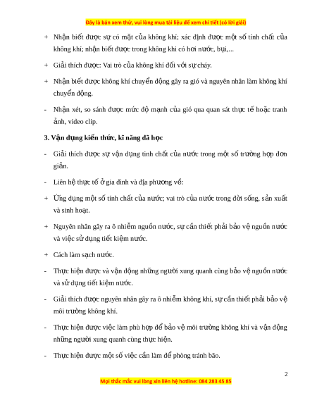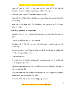 ộ g gây ra gió và nguyên nhân làm không khí chuy n ể đ n ộ g. - Nh n ậ xét, so sánh đ c ượ m c ứ độ m n ạ h c a ủ gió qua quan sát th c ự t ế ho c ặ tranh n ả h, video clip. 3. V n ậ d ng ụ ki n ế th c, ứ kĩ năng đã h c ọ - Gi i ả thích đ c ượ sự v n ậ d n ụ g tinh ch t ấ c a ủ n c ướ trong m t ộ s ố tr n ườ g h p ợ đ n ơ gi n ả . - Liên h ệ th c ự t ế ở gia đình và đ a ị ph n ươ g v : ề + n Ứ g d n ụ g m t ộ số tính ch t ấ c a ủ n c; ướ vai trò c a ủ n c ướ trong đ i ờ s n ố g, s n ả xu t ấ và sinh ho t ạ .
