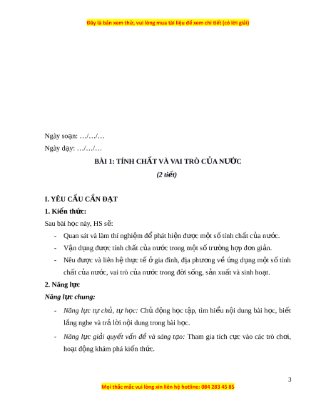 Ngày so n ạ : …/…/… Ngày d y ạ : …/…/… BÀI 1: TÍNH CH T Ấ VÀ VAI TRÒ C A Ủ NƯ C Ớ (2 ti t ế ) I. YÊU C U Ầ C N Ầ Đ T Ạ 1. Ki n ế th c: ứ Sau bài h c ọ này, HS s : ẽ