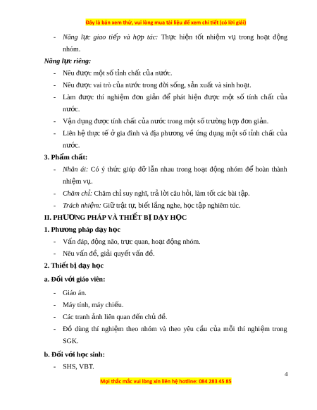 - Năng l c ự giao ti p ế và h p ợ tác: Th c ự hi n ệ t t ố nhi m ệ vụ trong ho t ạ đ n ộ g nhóm. Năng l c ự riêng: - Nêu đ c ượ m t ộ s ố t n ỉ h ch t ấ c a ủ n c. ướ - Nêu đ c ượ vai trò c a ủ n c ướ trong đ i ờ s n ố g, s n ả xu t ấ và sinh ho t ạ . - Làm đ c ượ thí nghi m ệ đ n ơ gi n ả để phát hi n ệ đ c ượ m t ộ số tính ch t ấ c a ủ n c. ướ - V n ậ d n ụ g đ c ượ tính ch t ấ c a ủ n c ướ trong m t ộ s ố tr n ườ g h p ợ đ n ơ gi n ả . - Liên hệ th c