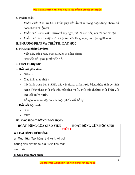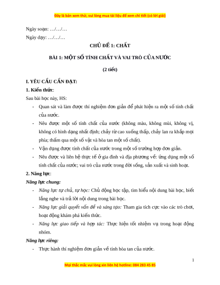 Ngày so n ạ : …/…/… Ngày d y ạ : …/…/… CHỦ Đ Ề 1: CH T Ấ BÀI 1: M T Ộ S Ố TÍNH CH T Ấ VÀ VAI TRÒ C A Ủ NƯ C Ớ (2 ti t) ế I. YÊU C U Ầ C N Ầ Đ T Ạ : 1. Ki n ế th c ứ : Sau bài h c ọ này, HS: - Quan sát và làm đ c ượ thí nghi m ệ đ n ơ gi n ả để phát hi n ệ ra m t ộ s ố tính ch t ấ c a ủ n c. ướ - Nêu đ c ượ m t ộ số tính ch t ấ c a ủ n c