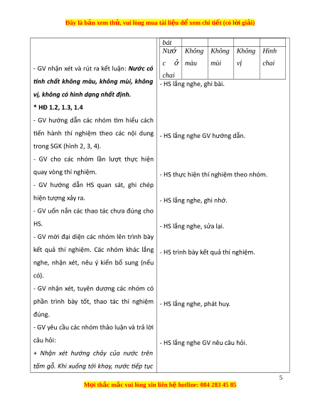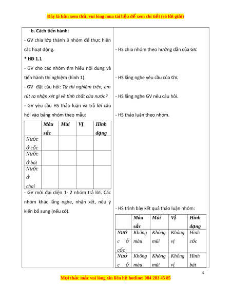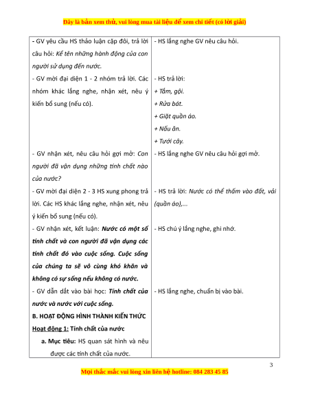 ệ đ xe ể m chi ti t ế (có l i ờ gi i ả ) Ngày so n ạ : …/…/… Ngày d y ạ : …/…/… CHỦ Đ Ề 1: CH T Ấ BÀI 1: TÍNH CH T Ấ C A Ủ NƯ C Ớ VÀ NƯ C Ớ VỚI CU C Ộ S N Ố G (2 ti t) ế I. YÊU C U Ầ C N Ầ Đ T Ạ : 1. Ki n ế th c ứ : Sau bài h c ọ này, HS: - Quan sát và làm đ c ượ thí nghi m ệ đ n ơ gi n ả để phát hi n ệ ra m t ộ s ố tính ch t ấ c a ủ n c. ướ - Nêu đ c ượ m t ộ số tính ch t ấ c a ủ n c