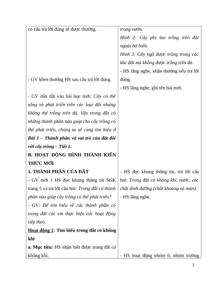 Giáo án Bài 1 Khoa học lớp 5 Kết nối tri thức: Thành phần và vai trò của đất đối với cây trồng