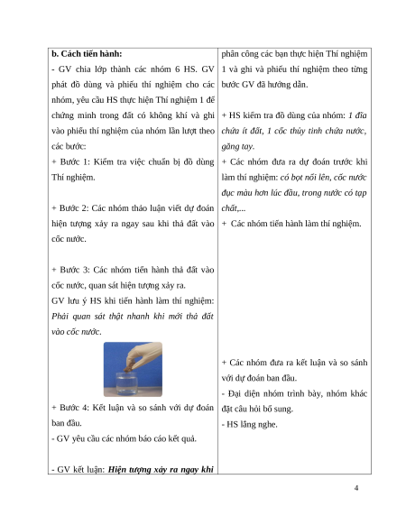 hiện tượng xảy ra ngay sau khi thả đất vào + Các nhóm tiến hành làm thí nghiệm. cốc nước.