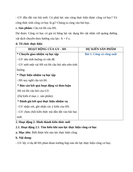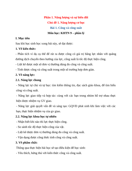 Giáo án Bài 1 Khoa học tự nhiên 9 Cánh diều (2024): Công và công suất