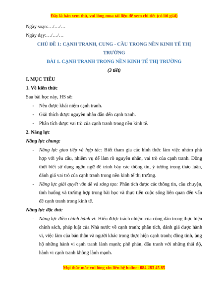BÀI 1. CẠNH TRANH TRONG NỀN KINH TẾ THỊ TRƯỜNG (3 tiết) I. MỤC TIÊU 1. Về kiến thức Sau bài học này, HS sẽ: