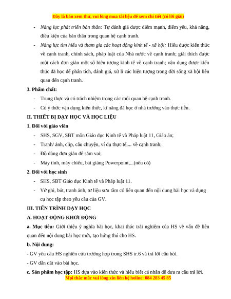 thức đã học để phân tích, đánh giá, xử lí các hiện tượng trong đời sống xã hội liên quan đến cạnh tranh. 3. Phẩm chất: