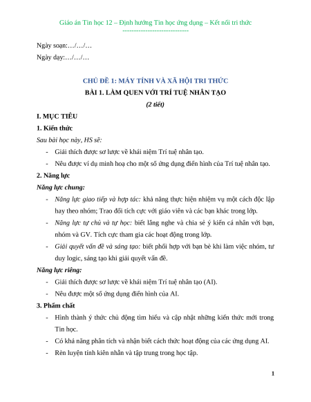 BÀI 1. LÀM QUEN VỚI TRÍ TUỆ NHÂN TẠO (2 tiết) I. MỤC TIÊU 1. Kiến thức