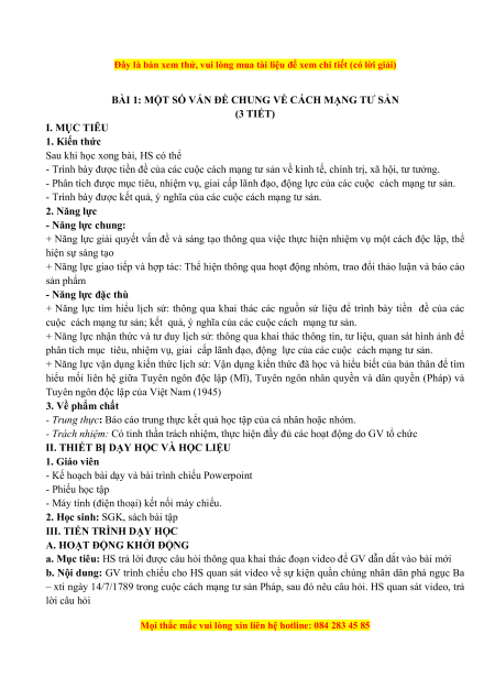 BÀI 1: MỘT SỐ VẤN ĐỀ CHUNG VỀ CÁCH MẠNG TƯ SẢN (3 TIẾT) I. MỤC TIÊU 1. Kiến thức