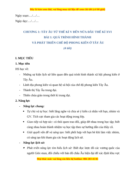 VÀ PHÁT TRIỂN CHẾ ĐỘ PHONG KIẾN Ở TÂY ÂU (4 tiết) I. MỤC TIÊU 1. Mục tiêu HS học về: