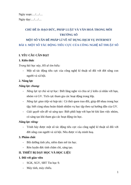 Giáo án Bài 1: Một số tác động tiêu cực của công nghệ kĩ thuật số Tin học 9 Cánh diều