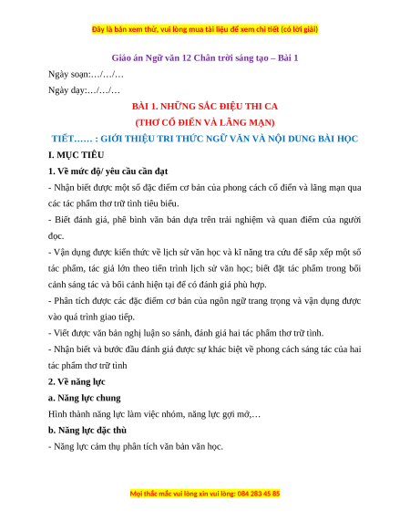 Giáo án Bài 1: Những sắc điệu thi ca Ngữ Văn 12 Chân trời sáng tạo