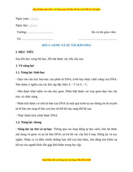 BÀI 1: GENE VÀ SỰ TÁI BẢN DNA I. MỤC TIÊU