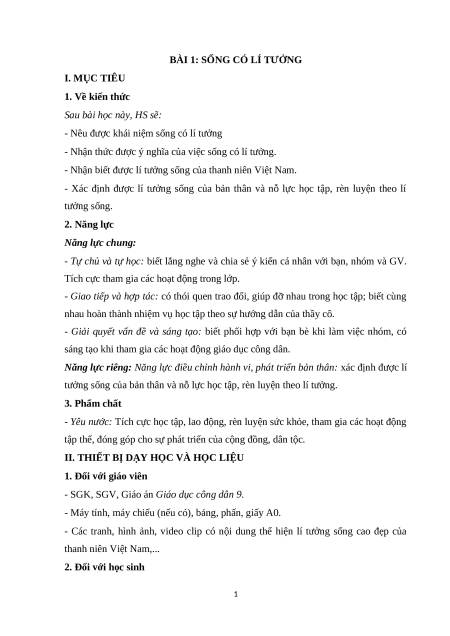 BÀI 1: SỐNG CÓ LÍ TƯỞNG I. MỤC TIÊU 1. Về kiến thức