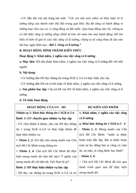a. Mục tiêu: HS nêu được khái niệm, ý nghĩa của việc sống có lí tưởng đối với mỗi người. b. Nội dung: