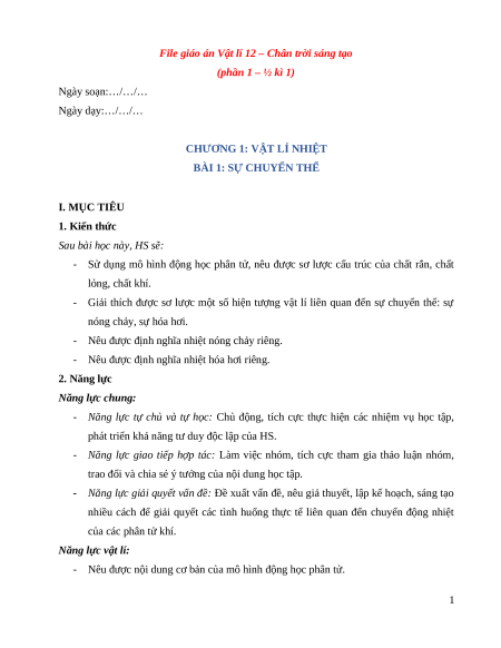 File giáo án Vật lí 12 – Chân trời sáng tạo