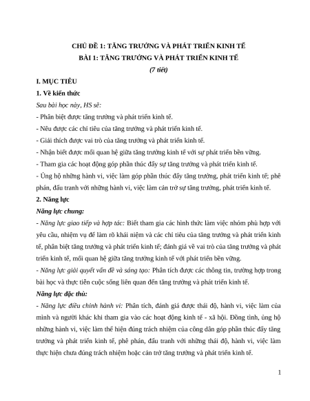 BÀI 1: TĂNG TRƯỞNG VÀ PHÁT TRIỂN KINH TẾ (7 tiết) I. MỤC TIÊU 1. Về kiến thức