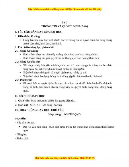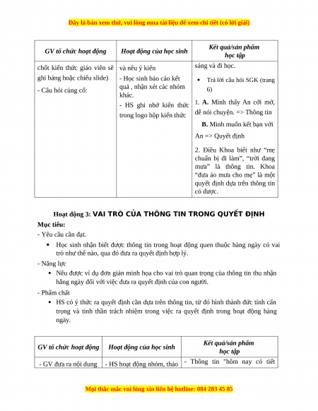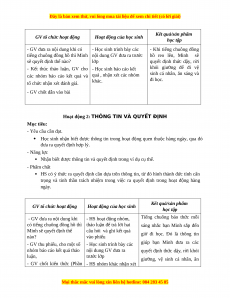 Trong bài học này học sinh được học về thông tin và quyết định, ba dạng thông